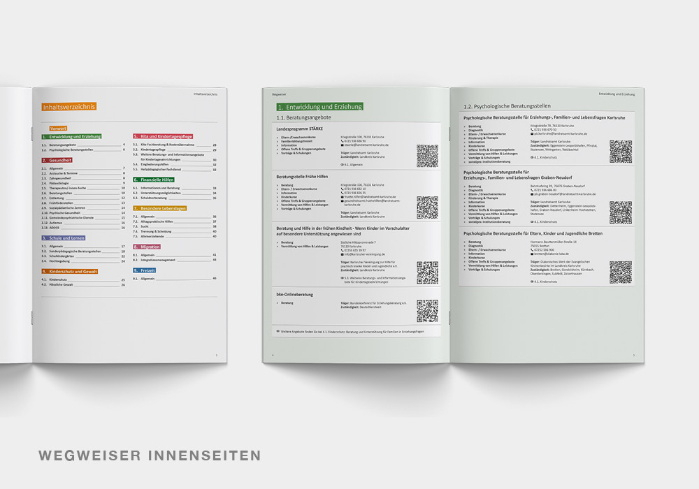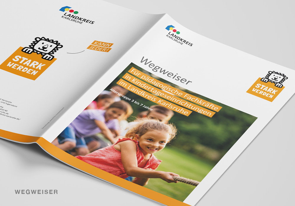Der Wegweiser ist als Kontaktübersicht und regionaler Wegweiser konzipiert: er bündelt wichtige Ansprechpartner, zentrale Angebote und Orientierungshilfen für pädagogische Fachkräfte in Kindertageseinrichtungen (Altersgruppe 3–7) im Landkreis Karlsruhe. Dezente Farben, saubere Typografie und ein aufgeräumtes Layout stehen im Vordergrund.