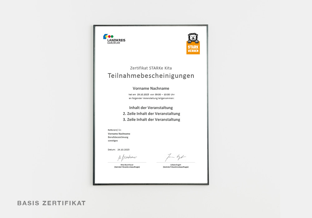 Wir haben zwei Basisprojekte vorbereitet, die eigenständig ausgefüllt werden können, sowie Zertifikate, Veranstaltungs-PDFs und A4-Plakate mit detaillierten Infos zu einzelnen Veranstaltungen. Alle Dateien sind so angelegt, dass der Kunde sie inhouse selbstständig ausfüllen und aktualisieren kann.
