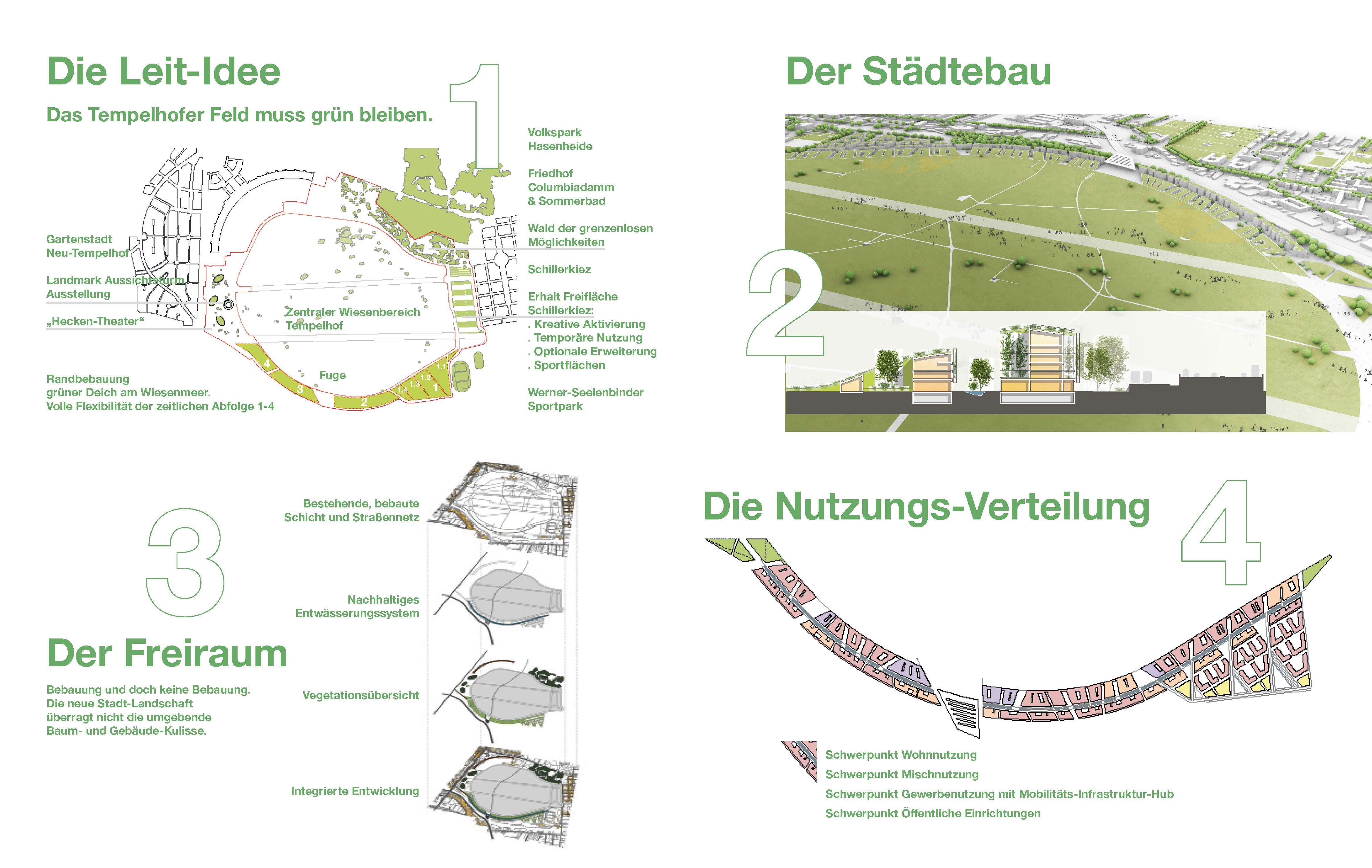 Der Kern des Vorschlags ist eine Begrenzung der Bebauung auf den Randbereich, während die zentrale Freifläche von 355 Hektar im Wesentlichen unangetastet bleibt. Als „Bebauung und doch keine Bebauung“ sieht das Konzept keine dominierenden Hochbauten vor. Stattdessen sollen sich terrassierte, drei- bis viergeschossige Baukörper als „Grüne Hügel“ oder „Hängende Gärten“ in die Landschaft einfügen. Diese Bauten sollen die bestehende Baum- und Gebäudekulisse nicht überragen und so den Weitblick über das Feld erhalten.